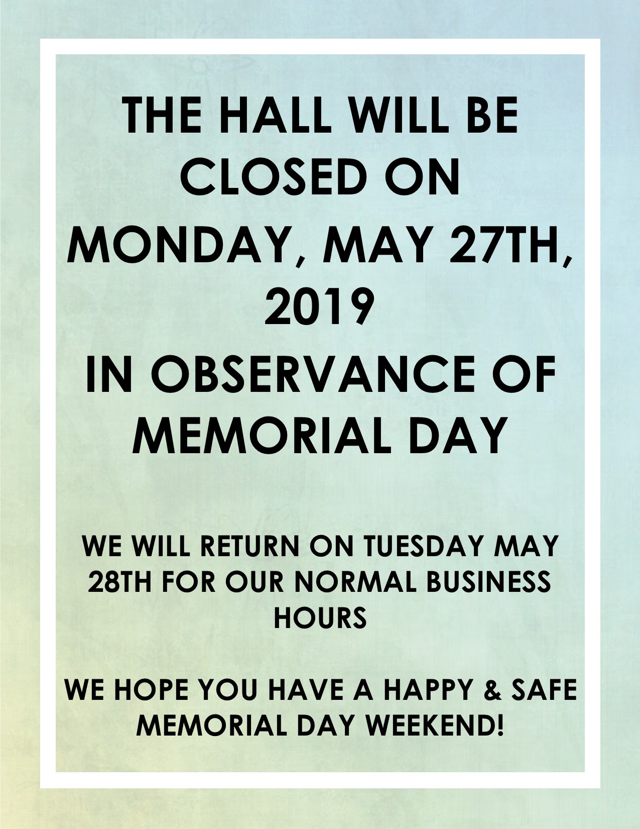 Hall Closed for Memorial Day