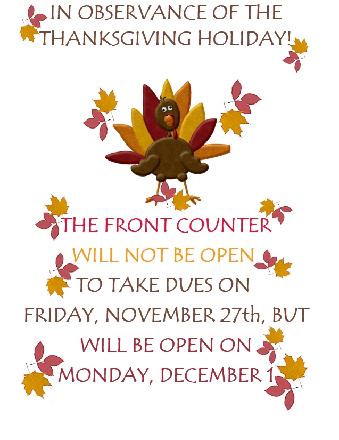 FRONT COUNTER THANKSGIVING HOURS